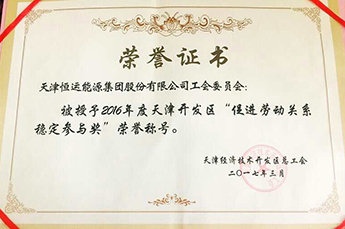 天津恒运集团股份有限公司工会委员会被授予2016年度天津开发区“促进劳动关系稳定参与奖“荣誉称号